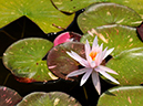 日本人好みの、葉っぱが斑入りになっている睡蓮。この睡蓮が咲いている池では、花も葉っぱも色鮮やかになる。